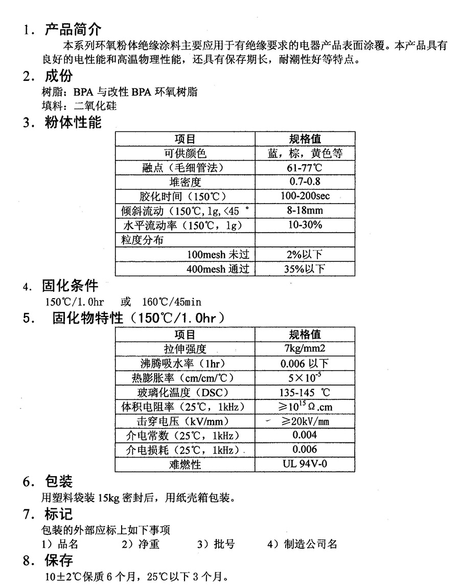 本系列環(huán)氧粉體絕緣涂料主要應用于有絕緣要求的電器產(chǎn)品表面涂。本產(chǎn)品具有良好的電性能和高溫物理性能,還具有保存期長(cháng),耐潮性好等特點(diǎn)。
