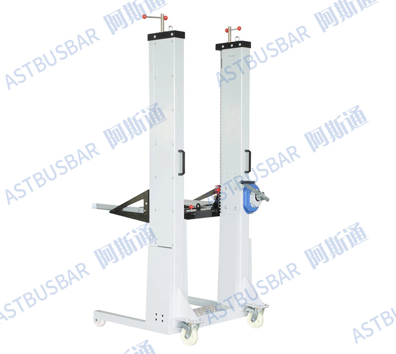 移動(dòng)式升降轉運車(chē)整體形式采用類(lèi)龍門(mén)式左右支撐,適用于全電流等級真空斷路器。轉運車(chē)的升降采用手搖絞盤(pán)旋轉鋼絲繩,驅動(dòng)前置托盤(pán)上下移動(dòng),為防止托盤(pán)脫落還有安全聯(lián)鎖裝置。前置托盤(pán)按照斷路器底盤(pán)車(chē)輔助開(kāi)關(guān)位置開(kāi)孔,可在轉運車(chē)上進(jìn)行維修。整體轉運車(chē)采用萬(wàn)向輪移動(dòng)靈活且具有剎車(chē)功能,可防止轉運車(chē)不穩溜車(chē)。